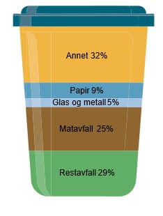 Dette er eit typisk restavfallsspann frå 2025. Berre 29% av innhaldet er faktisk restavfall, resten kan sorterast ut til materialgjenvinning.